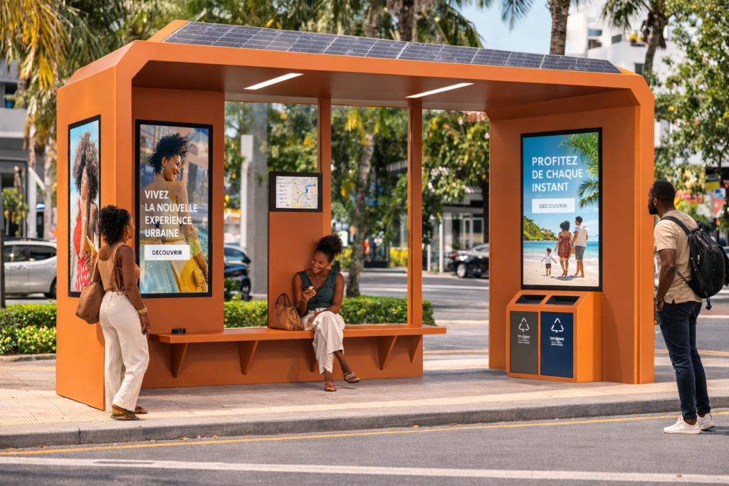 Écrans LCD haute luminosité visibles en plein soleil tropical. Contenus dynamiques et animations qui captent le regard des passants et usagers.